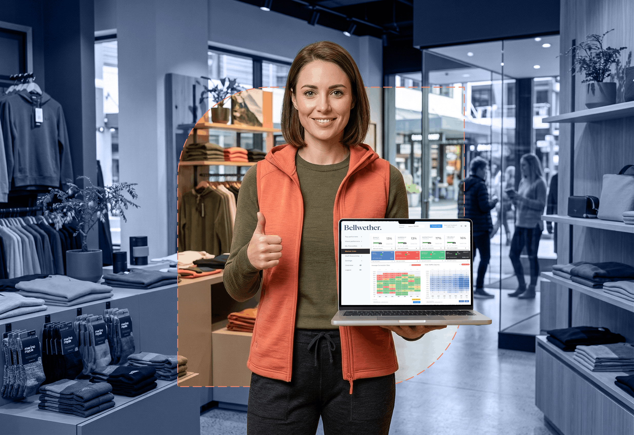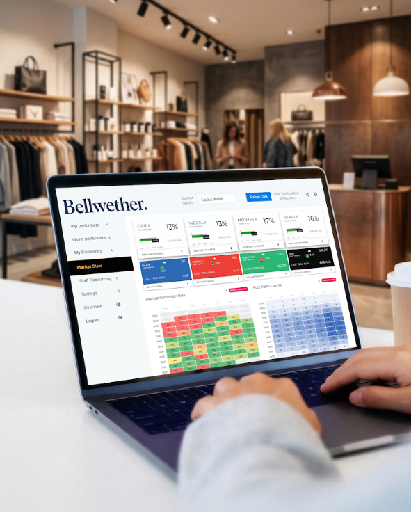 Bellwether is a retail performance system that combines people‑counting cameras, live trading data and expert support to show where customers are underspending - and how to turn those missed opportunities into sales. It gives you clear visibility over footfall, conversion, ATV and staff performance across all your stores.